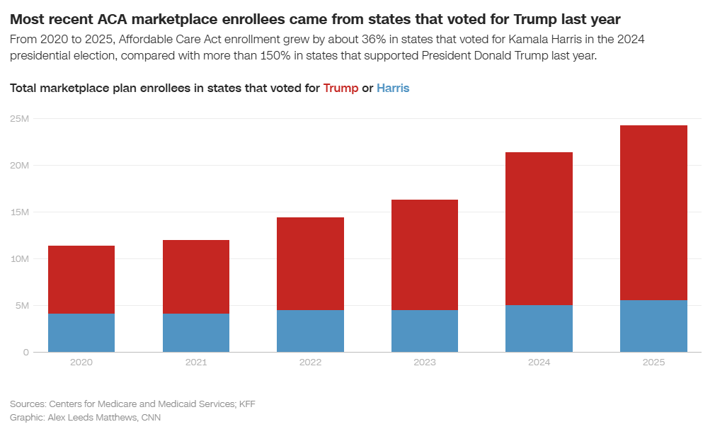 On the surface, this shutdown happened because Affordable Care Act subsidies, established in 2021 to help low and middle-income people afford healthcare, are set to expire at the end of the year. Their elimination will more than double annual premiums for millions of people, and a projected four million will lose their insurance entirely. Red states that declined to expand Medicaid (and therefore have more people using the ACA insurance market) will be hit hardest by this change.