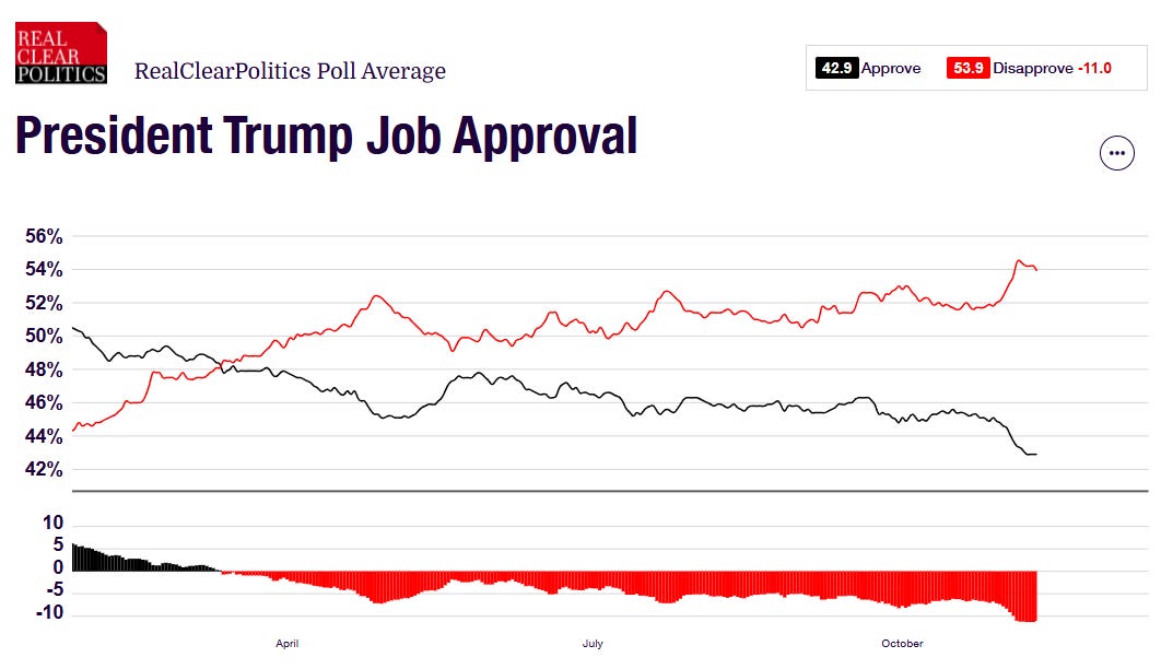 But the people disagreed. They handed the Democrats victory after unprecedented victory last Tuesday, and not just high profile races either—they swept everything from Mayor of New York to rural county commissioners across the country. Trump’s approval rating has trended steadily downward since the shutdown began, but fell off a cliff on November 1st when SNAP benefits failed to arrive. He’s not just at his lowest point this term, he’s nearly two points lower than his previous low point.