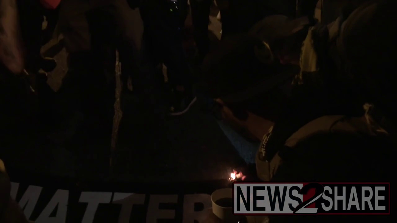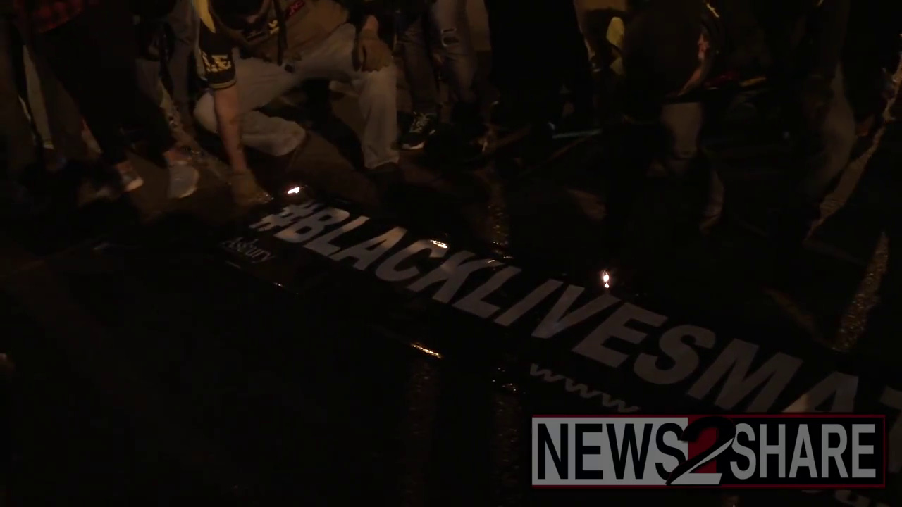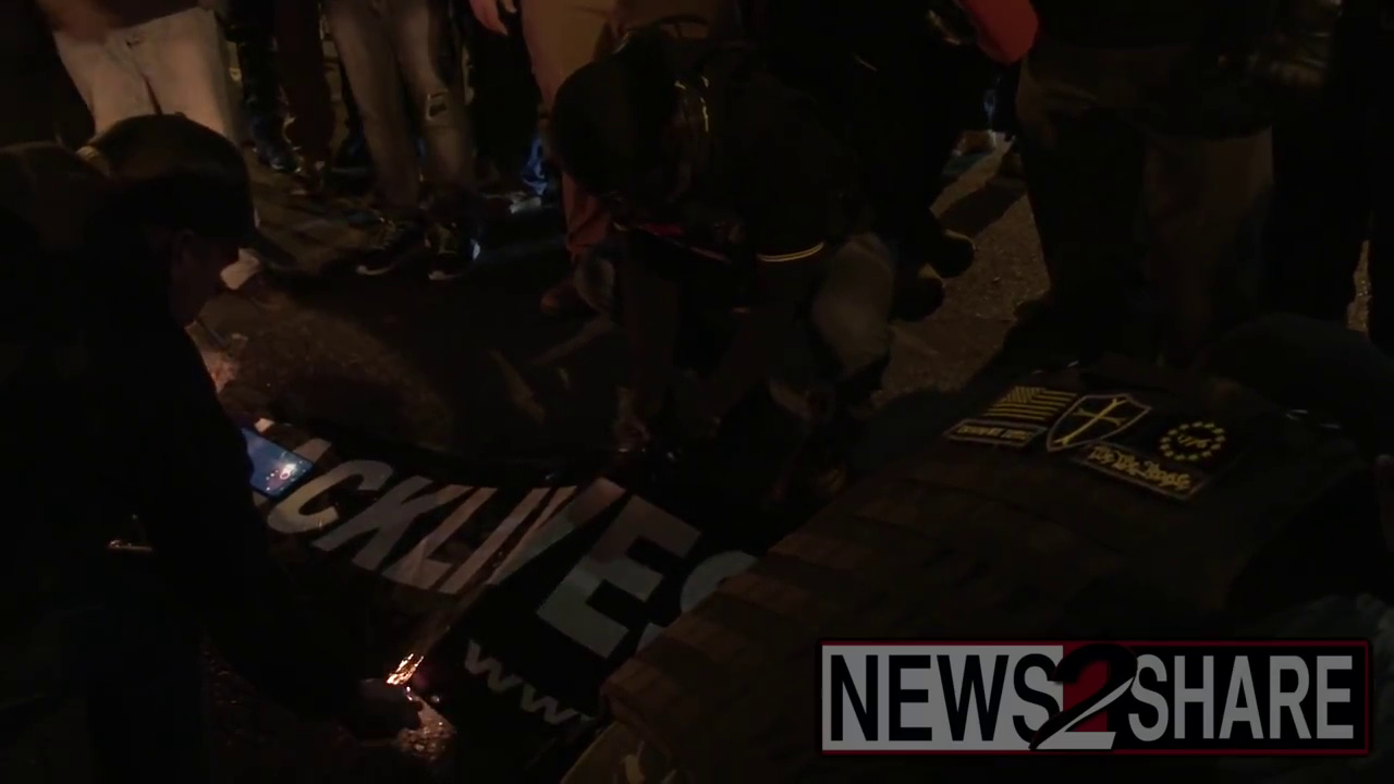 And here we have screenshots from News2Share, which has the clearest video of the incident, where we see many Proud Boys attempting to light the banner on fire. It takes a village, I guess.